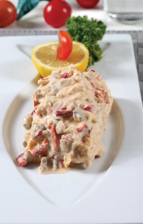 Tavaya mantarlar koyun. 7-8 dakika süreyle haşlayın. Krema, sarımsak, limon rendesi, taze soğan, kırmızı biber ve mantar bir tavaya ekleyip kremayı çektirin. Ayrı bir yerde balık filetoyu unlayıp sosun içine atın. 3-4 dakika pişirin. Sosu tabağın altına koyup balık filetoyu üzerine yerleştirin. Garnitür için; Sebzeleri tereyağında soteleyin. Köpük malzemelerini çırpma kabında çırpın. Servis tabağına aldığınız levreğin üzerine köpüğü dökün. Garnitür, Frenk soğanı ve maydanozu ile servis edin.