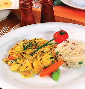 Doğradığınız soğanları ve sarımsakları pembeleşinceye kadar zeytinyağında kavurun. Sonra ince şeritler halinde dilimlediğiniz tavukları ilave edin. Tavukların pişmesine yakın yarım çay bardağı kremayı boşaltın. Kaynayan yemeğe ince uzun uzun doğradığınız renkli biberleri ve baharatları koyarak, krema koyulaşıncaya kadar ağır ateşte kaynatın. Bu arada yemeği ağır ağır karıştırmayı ihmal etmeyin. Dibine tutmamasına dikkat edin. Yemeğiniz servise hazırdır. Servis ederken ince kibrit şeklinde kestiğiniz kornişon turşu ve maydanozları üzerine serpiştirin.