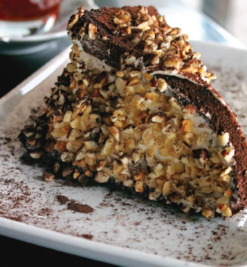 Pandispanyayı yuvarlak bir kalıba (cam da olabilir) döşeyin. İçine muhallebiyi dökün. Pandispanyadan kalan parçalar varsa muhallebinin üzerini bu parçalar ile kapatın. Yoksa streç folyo ile kapatıp buzdolabında en az 3 saat bekletin. Servis etmeden önce kalıbından ters çevirerek tabağa aktarın. Dilimleyip isteğe göre file badem-fındık karışımına bulayın. Hemen servis yapın.
