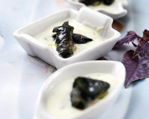 İri yapraklı (her biri avucunuzun yarısı kadar olmalı) reyhanı sıcak suda birkaç saniye kadar tutup çıkartın. Soğuk sudan geçirip hemen süzün. İki adet reyhan yaprağını üst üste serip hazırladığınız iç malzemeden yerleştirin. Rulo şeklinde sarma gibi sarın. Zeytinyağından 1 çorba kaşığı kadarını tencereye fırça yardımı ile sürün ve 1 demet reyhanı da tencereye yayın. Üzerine sarmaları yerleştirin. Çok kısık ateşte 5 dakika pişirin. Tencerenin kapağını kapatın. İsteğe göre sarımsaklı yoğurtla servis yapın.