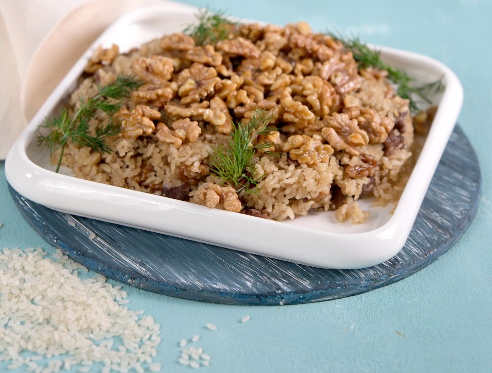 Başka bir tavada tereyağında California cevizini 2–3 dakika, hafif renk alana kadar kavurun. Pilav piştikten sonra 10 dakika dinlendirin, ardından üzerine kavurduğunuz California cevizini ekleyin. Üzerine maydanoz veya dereotu koyarak servis edin.