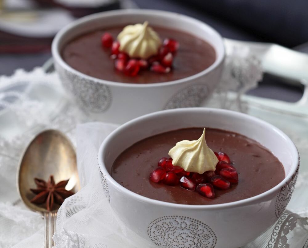 Sütü, unu, nişastayı, kakaoyu, vanilyayı ve şekeri tencereye aktarıp çırpma teliyle iyice çırpın. Orta ateşte, sürekli karıştırarak muhallebi kıvamına gelene dek pişirin. Ocaktan indirmeye birkaç dakika kala tereyağını ve irice doğranmış bitter çikolatayı ilave edin. Pütürsüz bir kıvam elde edince ocaktan alın. Ilınınca mikser yardımı ile iyice çırpın ve servis kaselerine aktarın. İsteğe göre mevsim meyveleri ve beze ile süsleyin. Soğuk servis yapın.