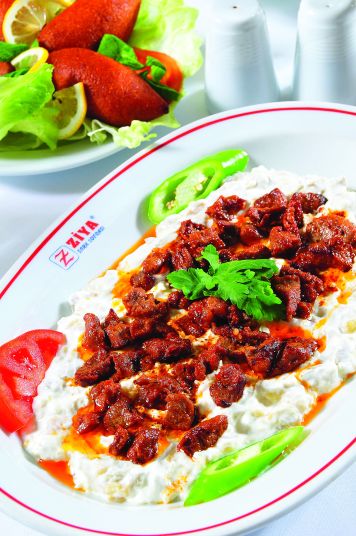 Çöp şişlik etleri bıçakla doğrayın ve tereyağında soteleyin. Sotelerken içine az miktarda renkli biber katın. Patlıcanları ateşte közleyin. Sonra kabuklarını soyun ve bir çatal yardımı ile ezin. Geniş bir tavada tereyağını eritin. Ardından sarımsak, patlıcan ve yoğurdu ekleyip iyice karıştırın. İstediğiniz kıvama geldiğinde sosu servis tabağına yayın. Kızaran etleri üzerine yayın. Tavada kalan yağı üzerinde gezdirin. Sivri biber, domates ve maydanoz eşliğinde servise sunun.
