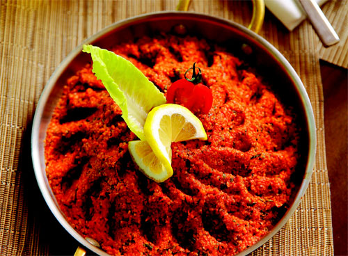 Geniş bir tepsiye bulguru aktarın. Salçaları ekleyin. Sıcak suyu ilave edip iyice karıştırın. Kuru reyhanı da ekleyip tatlandırın. Tepsinin üzerini bir kapakla kapatın, yeterince şişmesi için yarım saat kadar bu şekilde bekletin. Yeşillikleri çok ince kıyıp yeterince dinlenmiş bulgurlu karışıma ilave edin. Karıştırıp kalan malzemeyi de ekleyin. Marul yaprakları ile süsleyip servis yapın.
