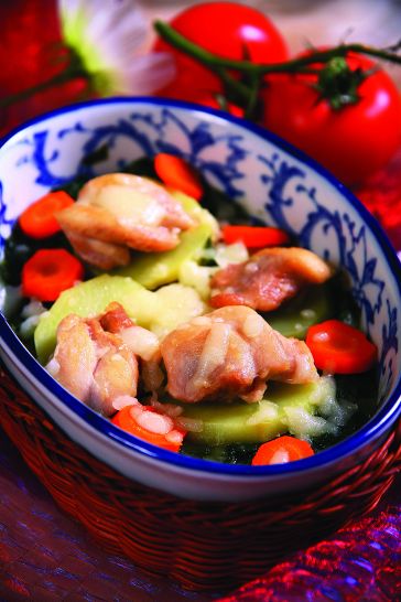 Patatesleri ve havucu temizleyip, soyun ve halka halka dilimleyin. Tuzlu suda 5 dakika haşlayın. Ispanağı çok az sıvı yağla tavada döndürün. Tavukgöğsünü kuşbaşı yapıp, çok az sıvı yağda her tarafı kızarak şekilde pişirin, tuz karabiber serpin. Sebzelerle tavuk etini karıştırın, bir fırın kabına yerleştirin. Sütü üzerine dökün, karabiber serpin, daha sonra üzerine rendelenmiş kaşar serpip 200 derecelik fırında 20-25 dakika pişirin.