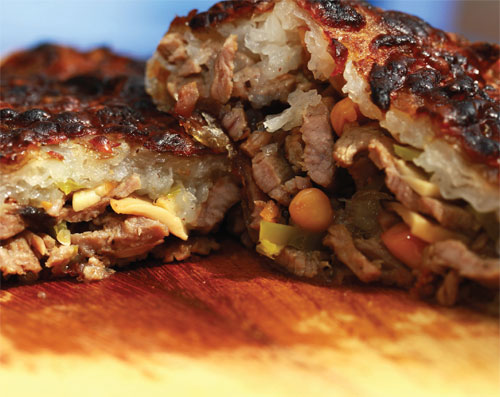 Eti jülyen doğrayıp çukur bir kaseye alın. Zeytinyağının yarısını, tuzu ve taze çekilmiş karabiberi ilave ederek yavaşça ovun. Bu şekilde buzdolabında birkaç saat bekletin. Çarliston biberleri, çekirdeklerini temizleyip halka halka doğrayın. Sarımsakları kıyın. Mantarları nemli bir bezle silip jülyen doğrayın. Kalan zeytinyağını tavada harlı ateşte ısıtın ve eti ilave edin. Et suyunu salmadan mühürleyin. Biberleri ve sarımsakları ekleyin. Ayrı bir tavada mantarları ve yer fıstığını birkaç tatlı kaşığı zeytinyağı ile birlikte kavurun. Ocaktan alın ve hemen ete ilave edin. Eti birkaç dakika daha pişirip ocaktan alın. Güllaç yapraklarını tek tek, ılık et suyunda çok fazla bekletmeden yumuşatın. Yaprakları üst üste serip ortasına eti yerleştirin ve zarf şeklinde katlayın. Üzerine rendelenmiş kaşar peyniri serpin, pekmezi gezdirin. Yağlanmış fırın tepsisine yerleştirin. Önceden ısıtılmış 200 dereceye ayarlı fırında 25 dakika kızartın. Fırından alın, servis yapın.