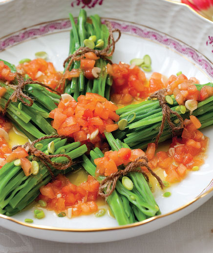 Sosu için; Domatesleri yıkayıp kabuğunu soyduktan sonra zar şeklinde doğrayın. Soğan ve sarımsakları da soyup ince ince kıyın. Fesleğen yapraklarını da doğrayın. Tüm malzemeyi geniş bir kâsede karıştırın. Şekeri, zeytinyağını, limon suyunu, tuzu ve karabiberi ekleyip tatlandırın. Sosunuz hazırdır. Hazırladığınız sosu fasulye buketlerinin olduğu servis tabağına yayın.