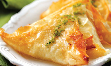 Muhallebisi için; Sütü ve irmiği tencereye aktarın. İyice çırpın. Kısık ateşte, muhallebi kıvamına gelene dek pişirin. Ocaktan alın, pütür pütür olmaması için arada bir çırparak soğutun.  Tereyağını eritip ılıtın. Yufkaları geniş bir tezgahın üzerinde aralarına eritilip ılınmış tereyağı sürerek üste üste olacak şekilde tek tek açın. Yufkadan 10 cm’lik kareler kesin. Her karenin kenarına kremadan yerleştirin ve üçgen şeklinde katlayıp yağlanmış fırın tepsisine yerleştirin. Önceden ısıtılmış 180 dereceye ayarlı fırında, yufkalar iyice kızarıncaya kadar pişirin. Fırından alın, börekler sıcakken ılık şerbeti üzerlerine dökün. Soğuyunca üzerlerine Antepfıstığı içi serpin. Servis yapın.