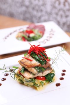 Patatesi bir kabın içine küp şeklinde doğrayın. İçine kuru soğanı, maydanozu, hardalı, mayonezi, tuzu katın. Son olarak karabiber ile tatlandırarak harmanlayın. Hazırladığınız salatayı bir kalıp yardımıyla servis edeceğiniz tabağa yerleştirin. Bir tavada tuz ve karabiberle tatlandırdığınız levrekleri parçalara ayırıp, her iki tarafını kızartın. Aynı şekilde ayrı bir tavada ıspanakları çok az soteleyin. Hardallı patatesin üzerine, sırasıyla bir kat ıspanak bir kat balık olacak şekil de (kule) dizip, kızgın yağda kızarttığınız renkli biberler ve biberiye ile süsleyerek servis yapın.