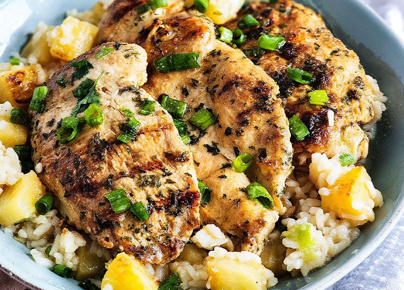 Yağlanmış ızgaranızı veya ocak üstü ızgara tavanızı orta-yüksek ateşte ısıtın. Tavukları her iki yüzünü 5-7 dakika kadar, sık sık ananaslı karışımdan sürerek, tamamen pişene ve güzelce kızarana kadar ızgarada pişirin. Geniş bir tavaya biraz sıvı yağ ekleyin ve orta ateşte ısıtın. Ananas parçalarını tavaya alıp karamelize olup altın rengini alana kadar pişirin. Pişmiş pirinci tavaya ekleyin. Doğranmış taze soğanları da ekleyin ve tuz, karabiberle tatlandırın. Tüm malzemeleri iyice karıştırın ve ısıtın. Izgara tavukları ananaslı pilavın üzerine yerleştirin, üzerine taze soğan serpin. Arzu ederseniz kalan ananaslı sostan gezdirerek servis edin. Afiyet olsun!