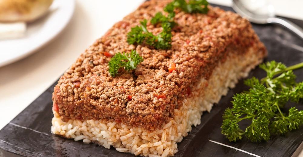 Kalan 1 yemek kaşığı tereyağı ile sıvı yağı tencerede ısıtın. Yıkayıp süzdüğünüz pirinci ekleyin. Sürekli karıştırarak yaklaşık 5 dakika boyunca kavurun. Ölçülü sıcak suyu ilave edin. Önce yüksek ateşte, 2 dakika kaynatın. Sonra tuzunu ekleyin. Tencerenin kapağını kapatın, ateşi de iyice kısın. Pirinç suyunu çekene dek pişirin. Pilav pişince ocaktan alın, minik küpler halinde doğrayıp buzdolabında beklettiğiniz tereyağını serpin. Kaşıkla hafifçe karıştırıp tekrar tencerenin kapağını kapatın. Kapağını açmadan 5 dakika dinlendirin. Dikdörtgen bir kabın dibine pilavı serpin, kaşıkla bastırarak yayın. Üzerine kıymalı karışımı serpin. Bu karışımın da üzerini kaşıkla düzleştirin. Servis tabağına ters çevirerek aktarın. Maydanozla süsleyip sıcak servis yapın.