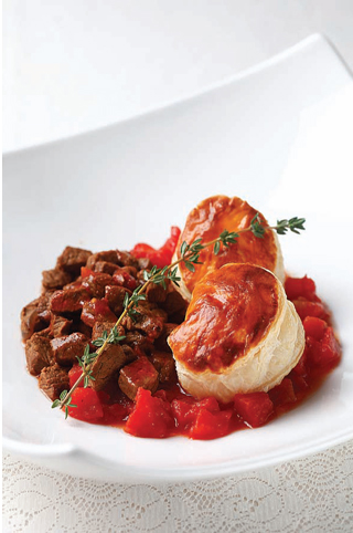 Sosu servis tabağına yayın. Milföy hamurları ile etleri de yerleştirin. Sıcak servis yapın.