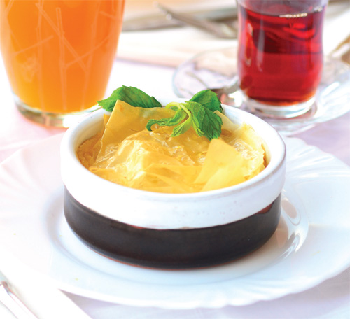 Fırın tepsisini yağlayın. İlk yufkayı tepsiye serin ve üzerine eritilip ılınmış tereyağından sürün. 8 kat olacak şekilde kalan yufkaları da yağlayıp üst üste serin. Soğuyan muhallebiyi sekizinci katın üzerine yayın. Kalan yufkaları da aynı şekilde aralarına tereyağı sürerek teker teker yerleştirin ve en üste de kalan tereyağını sürün.