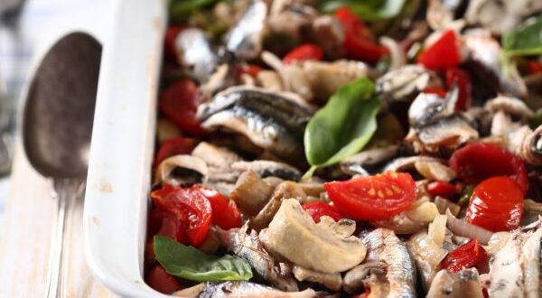 Sarımsakları kıyın. Biberleri halka halka, soğanı piyaz doğrayın. Doğradığınız sebzeleri 2 çorba kaşığı zeytinyağında 5 dakika kavurun. Ocaktan alıp ısıya dayanıklı fırın kabına yayın. Mantarları nemli bir bezle silip dörde kesin. Daha sonra 2 çorba kaşığı zeytinyağında birkaç dakika kavurun. Ocaktan alıp fırın kabına yaydığınız sebzelerin üzerine yayın. Tuz ve taze çekilmiş karabiberi de serpin. Kiraz domatesleri de dörde bölün ve temizlenmiş hamsilerle birlikte karıştırıp fırın kabına yayın. En son küçük küçük tereyağı parçalarını serpin. 200 dereceye ayarlı fırında 20-25 dakika pişirin. Sıcak sıcak servis yapın.
