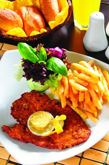 Tavuk göğsünü ince fileto haline getirdikten sonra un, yumurta ve cips ile paneleyin. Tavuk ve patatesi yağda kızarttıktan sonra Akdeniz yeşillikleri ile servise hazırlayın.