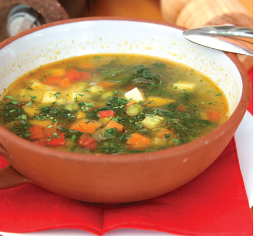 Havuç ve soğanı tencerede kısık ateşte kavurun. Daha sonra kabak ve biberleri ekleyin. Ardından tavuk suyunu ilave edin. Bir taşım pişirdikten sonra patates, bezelye, ıspanak, tuz ve karabiberini atarak çorbayı kaynamaya bırakın.