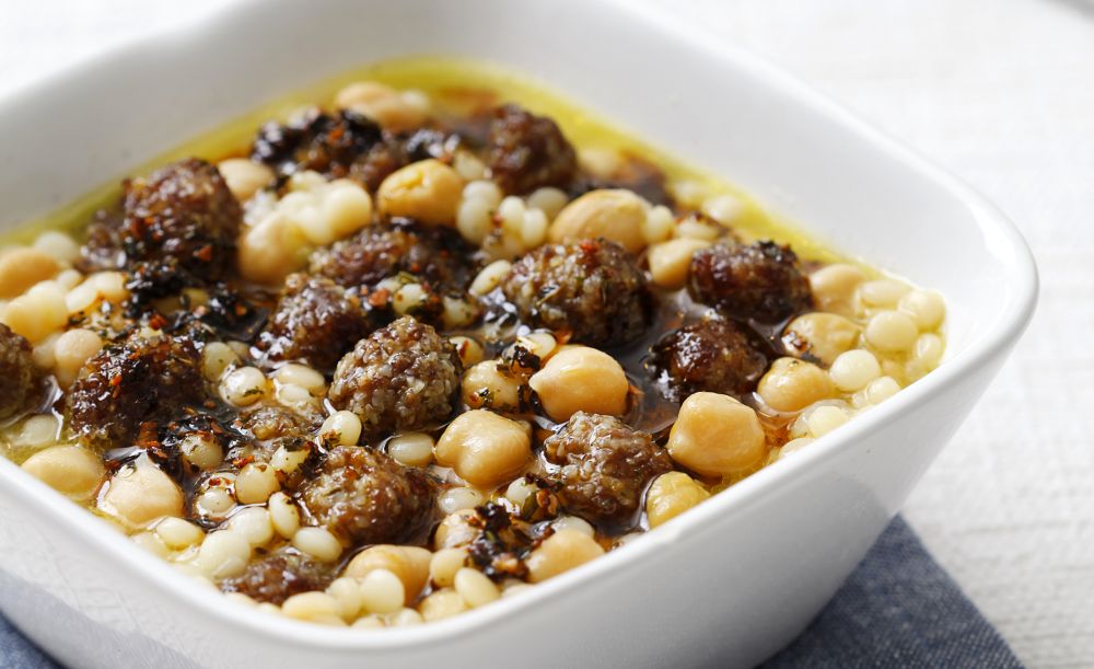 Soğanı soyup yemeklik doğrayın. Sıvı yağda yumuşayıncaya kadar kavurun. Kuskusu ilave edip birkaç dakika daha kavurmaya devam edin. 4,5 bardak sıcak suyu, haşlanmış nohudu, yağda kızarmış misket köfteleri ve tuzunu ekleyin. Tencerenin kapağını kapatın. Orta ateşte 10 dakika pişirin. Ocaktan alın. Üzeri için tereyağında kavrulmuş nane ile pul biber karışımını hazırlayın. Sıcak servis yapın.