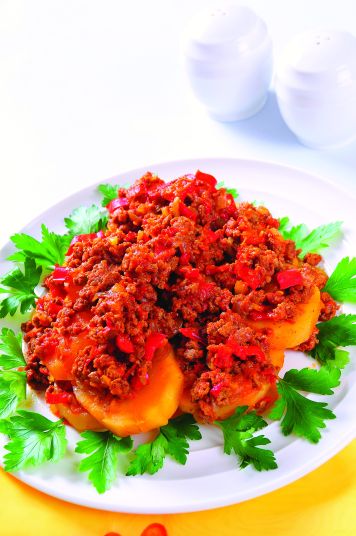 Soğanları ve biberleri ince doğrayın. Kıymayı tencerede kavurun. Soğan ve biberleri zeytinyağını ekleyip kavrulunca, rendelediğiniz domatesleri ve salçaları ekleyin. Kavrulup suyunu çekince ateşten alın. Patatesleri soyup yarım santim kalınlığında dilimleyin. Patatesleri tencereye dizin. Üzerine kıymalı sosu gezdirin. Yeteri kadar tuz ve karabiber serpin. 1 çay bardağı sıcak su ekleyip pişmeye bırakın. Patatesler yumuşayınca ateşten alıp servise sunun.