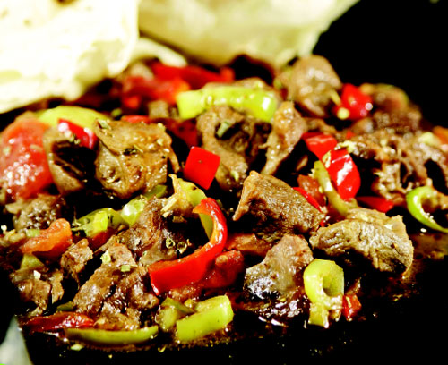 Domateslerin kabuğunu soyup zar şeklinde doğrayın. Biberleri temizleyip aynı şekilde doğrayın. Sacda veya derin bir wok tavasında tereyağını eritip etleri ilave edin. Suyunu salıp çekene dek sürekli karıştırarak kavurun. Sırasıyla biberleri ve domatesleri ekleyip yüksek ateşte kavurmaya devam edin. Ocaktan alın. Tuz ve baharatını ekleyip tatlandırın. İsteğe göre lavaş ekmeği ile servis yapabilirsiniz.