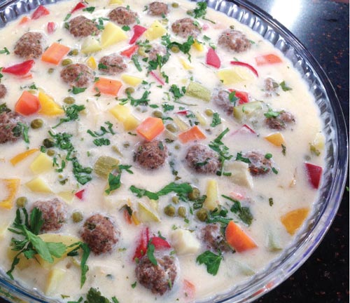 Öncelikle kuru soğanı, sarımsağı, dana kıymayı, baharatları ve mutfak robotundan geçirilmiş tost ekmeğini karıştırıp güzelce yoğurun. Karışımdan misket büyüklüğünde köfteler yapın. Bir tencerenin yarısına kadar su ilave edip kaynatın. Sebzeleri eşit bir şekilde küp küp doğrayın ve kaynayan suda önce zor pişenleri eklemek kaydıyla haşlayın. En son köfteleri ekleyin. Bir kabın içinde un, yoğurt ve limonu biraz suyla koyu ayran kıvamında hazırlayıp kaynayan sebzeli köfteye yavaşça ekleyin. Bir süre pişirdikten sonra servis aşamasına geçin. Servis ederken; sıvı yağda hafif kavrulmuş pul biber sosunu üzerine gezdirin.