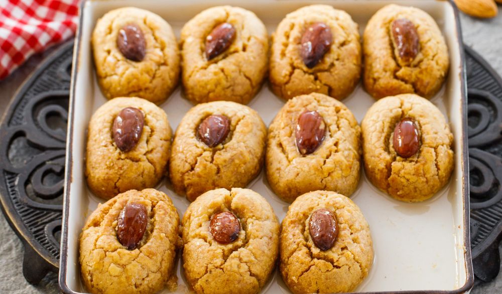 Şerbet için su ve şekeri 15 dakika kaynatın. Ocaktan alıp bekletin. Oda ısısında yumuşatılmış margarin, yumurtalar ve şekeri hamur yoğurma kabında karıştırın. Kabartma tozu, vanilya ve yumuşak bir hamur elde eden kadar un ekleyip yoğurun. Hamurdan ceviz büyüklüğünde bezeler koparıp badem şeklini verin. Üzerlerine birer tane badem yerleştirin. İçine margarin sürülmüş fırın tepsisine hamurları irmiğe buladıktan sonra dizin. Önceden ısıtlmış170 derece fırında üzerleri kızarana kadar pişirin. Sıcak tatlıların üzerine soğuk şerbeti dökün. Şerbetini çektikten sonra servis edin.
