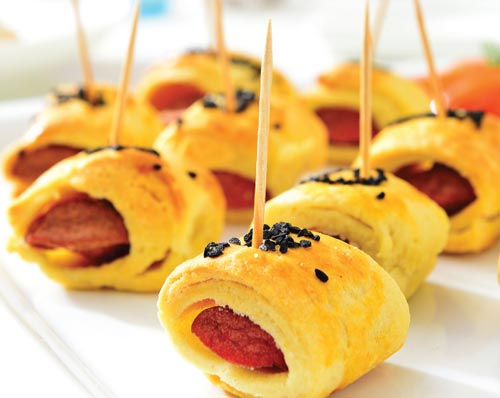 Tüm malzemeleri karıştırıp, yoğurun ve dinlenmeye bırakın. Merdane yardımıyla 30 cm çapında açın. Açtığınız yufkayı üçgen şeklinde kesin. İçine sosis koyarak sigara böreği sarar gibi sarın. 10 cm aralıklarla kesin. Fırın tepsisine dizin. Üzerine yumurta sarısı ve çörekotu sürüp, 180 dereceye ayarladığınız fırında pişirin.