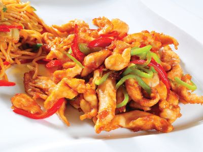 Noodle’ı kaynayan suda beş dakika haşlayın. Soğuk sudan geçirip bir kenarda bekletin. İnce kıyılmış biberlerin yarısını, soğanı, mantarı, havucu, sarımsağı, dört yemek kaşığı ay çiçek yağı ile hızlı ateşte ve wok tavada soteleyin. Noodle ilave edip, soya sosun dörtte birini ekleyin, karıştırıp bir kenarda sıcak muhafaza edin. Tavuk şeritlerini derin bir kaseye aktarın. Nişastayı, kalan soya sosunu ilave edip, iyice karıştırın. Sıvı yağı derin bir tavada ısıtın, kalan doğranmış biberleri ve tavuğu dağıtarak yağa ekleyin, piştikten sonra süzün. Sebzeli noodle ile birlikte servis edin.