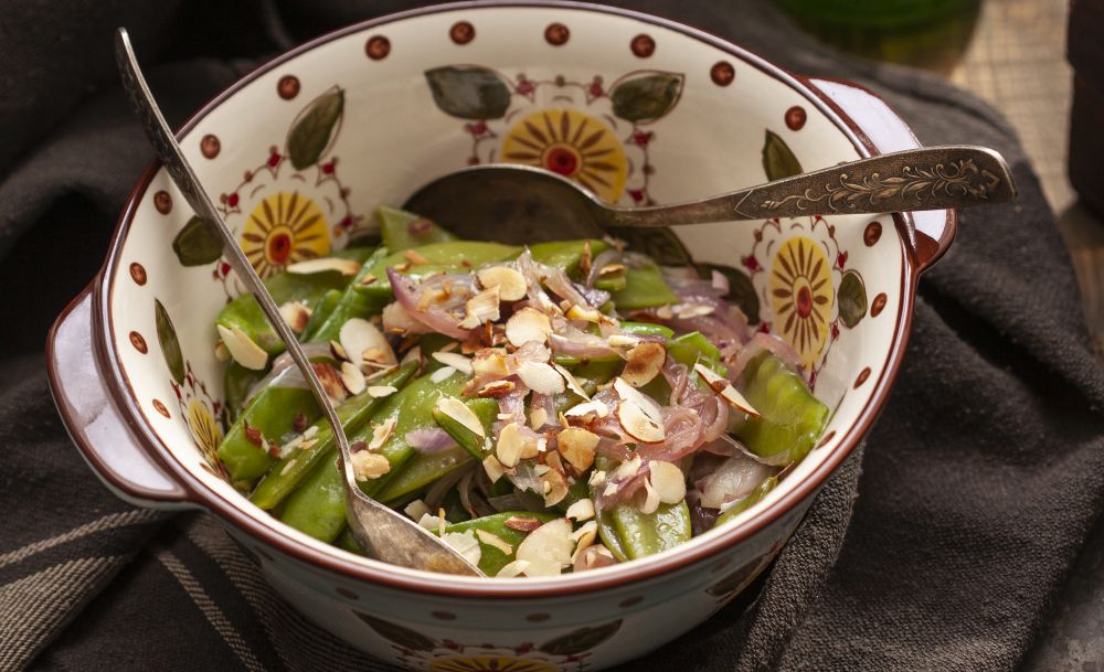 Soğanları piyazlık doğrayın. Ayrı bir tavaya alın. Üzerine 1 çay bardağı su, zeytinyağı, şeker ve bir tutam tuz ekleyin. Çok kısık ateşte soğanlar kahverengi olana kadar pişirin. Yapışmaz yüzeyli bir tavada, susam ve bademi yağsız olarak, kısık ateşte birkaç dakika kadar sürekli karıştırarak kavurun. Bezelyeleri servis yapacağınız tabağa alın. Üzerine soğanları, badem ve susam karışımını döküp servis yapın.