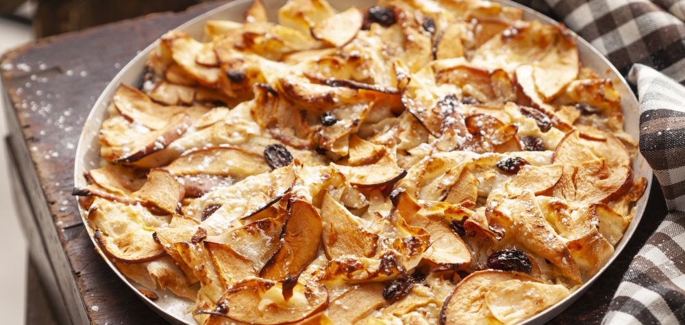 Elmayı incecik doğrayın. Yufkayı bütün olarak açın üzerine muhallebiyi her yerine gelecek şekilde fırça yardımıyla yayın. Üzerine elmaları ve kuru üzümleri eşit bir miktarda dağıtın. Bıçak yardımıyla 3-4 büyük parçaya ayırın ve parçaları elinizle büzerek altını hafifçe yağladığınız küçük bir fırın tepsisine (çapı 24-28 cm kadar) alın. Önceden ısınmış 200 dereceye ayarlı fırında, yaklaşık 20-25 dakika pişirin. Dilerseniz servis yaparken pudra şeker serpebilirsiniz.