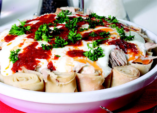Siron hamurlarını tepsiye dizin. Tavuk butlarını su dolu bir tencerede haşlayın. Tavuklar pişince küçük parçalara bölün. Tavuk suyunu üzerini geçecek kadar sironların üzerine gezdirin. Sironlar suyunu çekince tavuk etlerini üzerine yayın. Yoğurdu sarımsak ve tuz ilavesiyle çırpın. Tavukların üzerine dökün. Tereyağını eritin. Salça ve kırmızı biber ekleyip karıştırın. Ocaktan alıp, yoğurdun üzerine gezdirin. Maydanozla servis yapın.