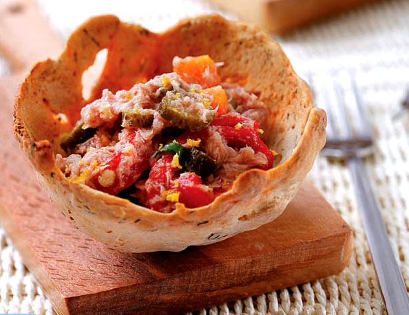 Kekikli ve Lorlu Ekmekler tarifindeki hamurun dinlenme aşamasını aynen uygulayın. Hamur yeterince dinlenince dört eşit bezeye ayırın. Her bezeyi ısıya dayanıklı, yuvarlak yağlanmış kalıpların tersine yapıştırın. Önceden ısıtılmış 200 dereceye ayarlı fırında pişirin. Pişen hamuru kabından dikkatlice çıkartın. İç malzemesi için ton balığı, jülyen doğranmış kırmızı biber ve kıyılmış dereotunu karıştırın. Karışımı çanakların içine paylaştırın. Hemen (iç malzemesini paylaştırdıktan sonra servis için çok bekletirseniz hamurun tabanı ıslanabilir) servis yapın.