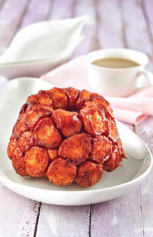 Hamurdan yarım ceviz büyüklüğünde küçük toplar elde edin. Her hamuru önce yağa (8 yemek kaşığı eritilip ılınmış tereyağı) sonra da tarçınlı şeker karışımına bulayın. Yağlanmış bir kek kalıbına, formunu oluşturacak şekilde bitiştirerek tamamlayın. Artan yağı üzerine dökün.