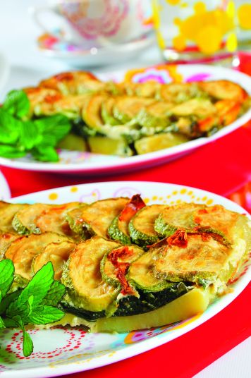 Patatesleri kabuklarıyla haşlayın. Soğuduktan sonra kabuklarını soyup, halka halka kesin, tuz ve karabiberle tatlandırın. Kuru soğan ve sarımsakları küçük küp şeklinde doğrayın. 1-2 yemek kaşığı sıvı yağda döndürün. Ispanakları ilave edin. Ispanaklar diriliğini kaybedince ocaktan indirin, tuz ve karabiber ekleyin. Kabakları halka halka kesin ve çok az sıvı yağda soteleyin. Isıya dayanıklı bir kabın içerisinde az miktarda sıvı yağ gezdirin. Önce halka şeklinde haşlanmış patatesleri kaba dizin. Üzerine ıspanakları döşeyin. En üstüne de halka dilimlediğiniz kabakları ekleyin. Taze kremanın içine 1 adet yumurtanın sarısını katın ve iyice çırpın. Kremayı sebzeli karışımın üzerine yayın. 180 dereceye ayarlı fırında 20-25 dakika süreyle pişirin.