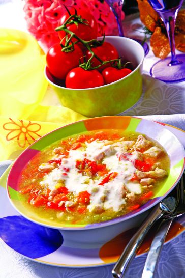Tavuk etlerini kuşbaşı doğrayın, temizlediğiniz havuçları ise küp şeklinde. Pırasaları ayıklayıp temizledikten sonra ince ince kıyın. Kırmızı biberlerin tohumlarını çıkardıktan sonra ince dilimleyin. Yayvan bir tencerede sıvı yağı kızdırıp, içine doğranmış tavuk göğüslerini ilave edip, kavurun. Kıyılmış pırasaları, kırmızı biberleri ve havuçları da atın ve kavurmaya devam edin. Bir bardak tavuk suyunun içine kepekli unu katın, iyice karıştırın. Karışımı yemeğe dökün, daha sonra kalan tavuk suyunu da ekleyin. Sebzeler yumuşayıncaya kadar iyice pişirin. Yemeğin pişmesine yakın yoğurdun içine yemeğin suyundan 2 yemek kaşığı kadar koyun, bir çatal yardımıyla karıştırın. Hazırladığınız terbiyeyi yemeğe ilave edin. Karıştırdıktan sonra kaynama noktasına gelene kadar pişirin ve sıcak olarak servis yapın.