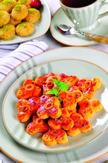 Yumurtaların sarısının birini ayırın. Oda ısısında yumuşamış margarine, yumurtaları, tuz, su, kaşar peyniri rendesini katıp, iyice karıştırın. Yavaş yavaş un ilave ederek hamuru yoğurun (Fazla yoğurmayın hamur bozulabilir). Merdane ile 1 santim kalınlığında açın. Yonca şeklindeki kalıpla kesin. Yağlanmış tepsiye dizin. Üzerlerine yumurta sarısı sürün. Kırmızı pul biber serpip ortasına dilim yeşil zeytin koyun. 180 derecede önceden ısıtılmış fırında pembeleşinceye kadar pişirin.